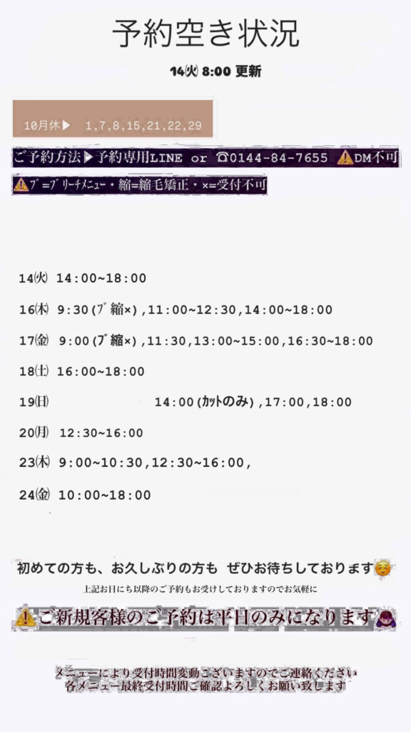 更新日時より約1週間分の予約状況です。予約状況は常に変わりますので目安としてご覧下さい。(Instagramに載せてるのと同じです)