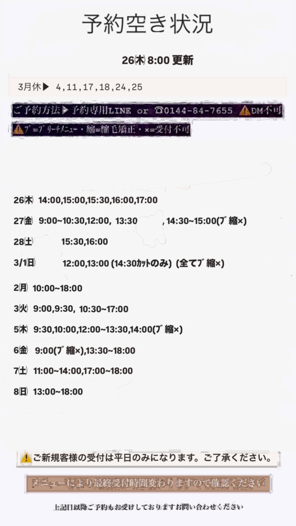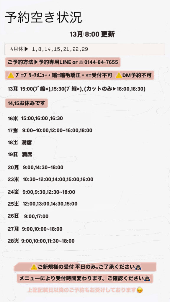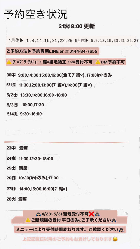 更新日時より約1週間分の予約状況です。予約状況は常に変わりますので目安としてご覧下さい。(Instagramに載せてるのと同じです)